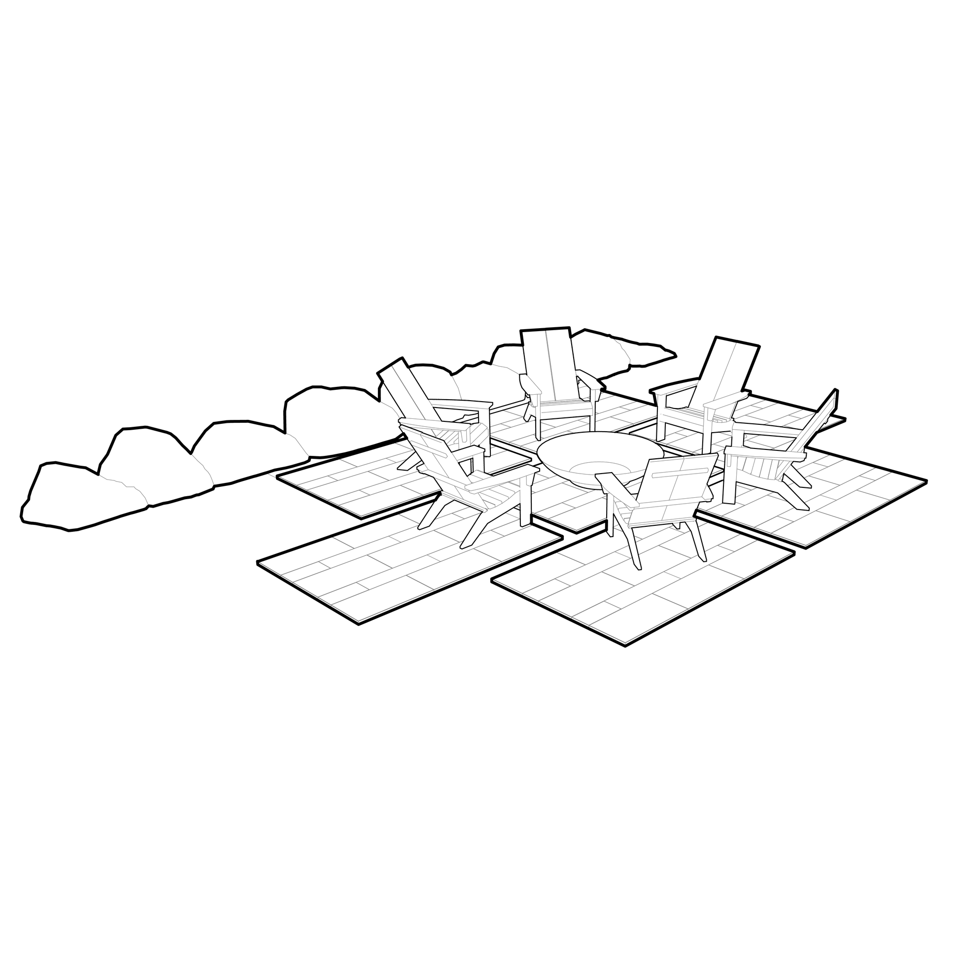Come together around a central fire pit with 6-8 of your friends and family. Seven large paver segments help this patio space bleed into the surrounding landscape while also providing enough surface area for plenty of stable seating. An informal boulder "wall" helps define the back of the space and provides a few extra seats if needed in addition to minor slop stabilization.
